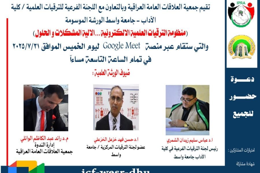 أقامت جمعية العلاقات العامة العراقية الورشة العلمية الموسومة:”منظومة الترقيات الإلكترونية: الآلية، المشكلات، والحلول”، وذلك بالتعاون مع (لجنة الترقيات العلمية المركزية في رئاسة جامعة واسط)و (لجنة الترقيات العلمية الفرعية في كلية الآداب / جامعة واسط), وذلك يوم الخميس الموافق 31 تموز 2025, عبر منصة (Google Meet).